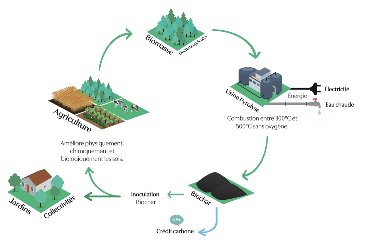 Le biochar constitue donc un puis de CO2 naturel. En effet, ce procédé permet de piéger le carbone des végétaux et donc d'éviter que celui-ci retourne dans l'atmosphère et ce, pendant des centaines d'années.